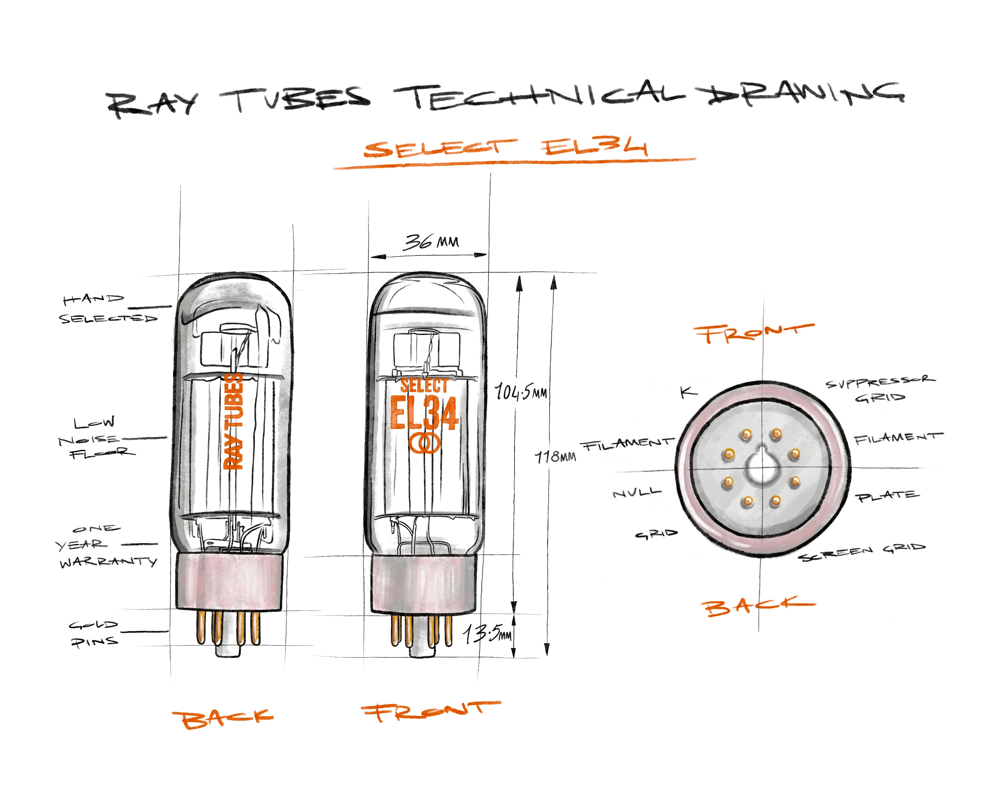Hand selected and tested, the Ray Tubes SELECT EL34 features gold pins for corrosion resistance and improved conduction. The SELECT Collection is a substantial upgrade from both New Old Stock and other new production tubes. Fewer than 5% of production meets our standards.